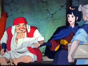 アシタカはエボシを問い詰めますが、村の病者から「その人を傷つけないでくれ」と説得されます。