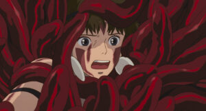 アシタカはタタリ神を「名のある山の主」と見抜き、村から出ていくよう説得。しかしタタリ神は聞く耳持たず、村の少女たちに襲いかかります。